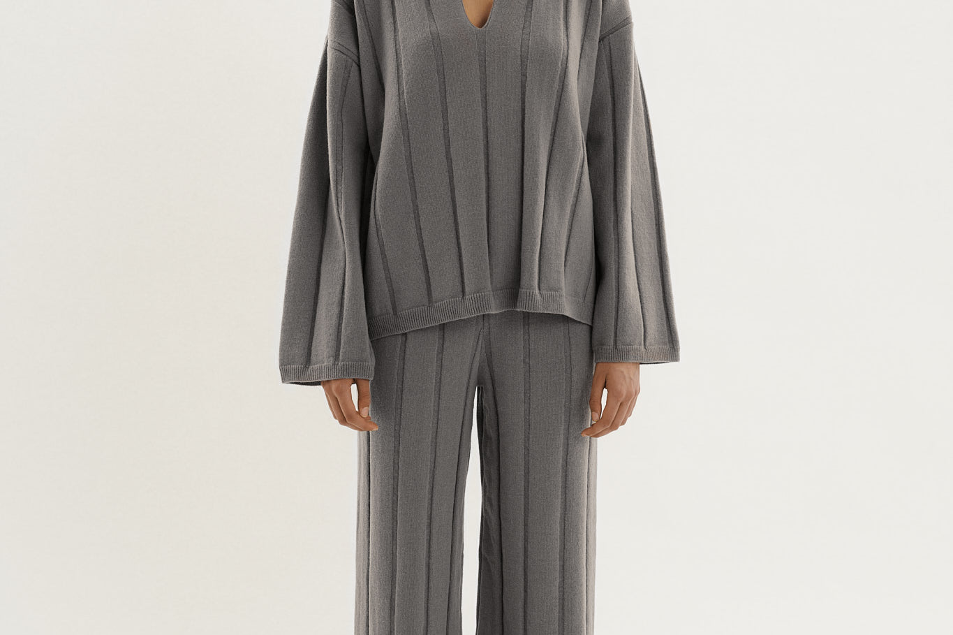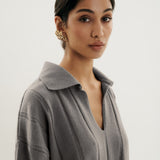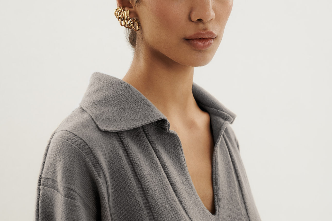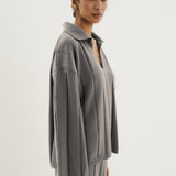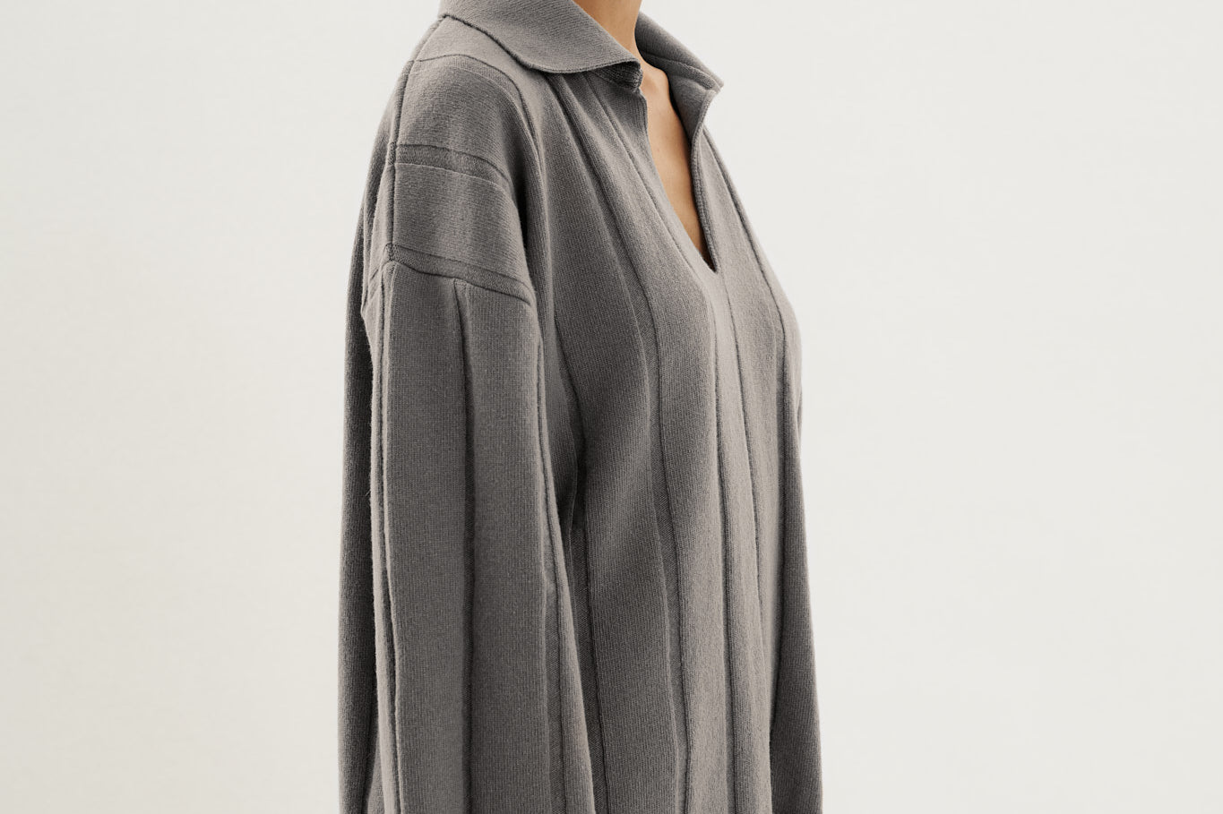 Rose is a v-neck collared top made entirely from high quality merino wool. It has a loose, cropped shaped and lowered shoulders.