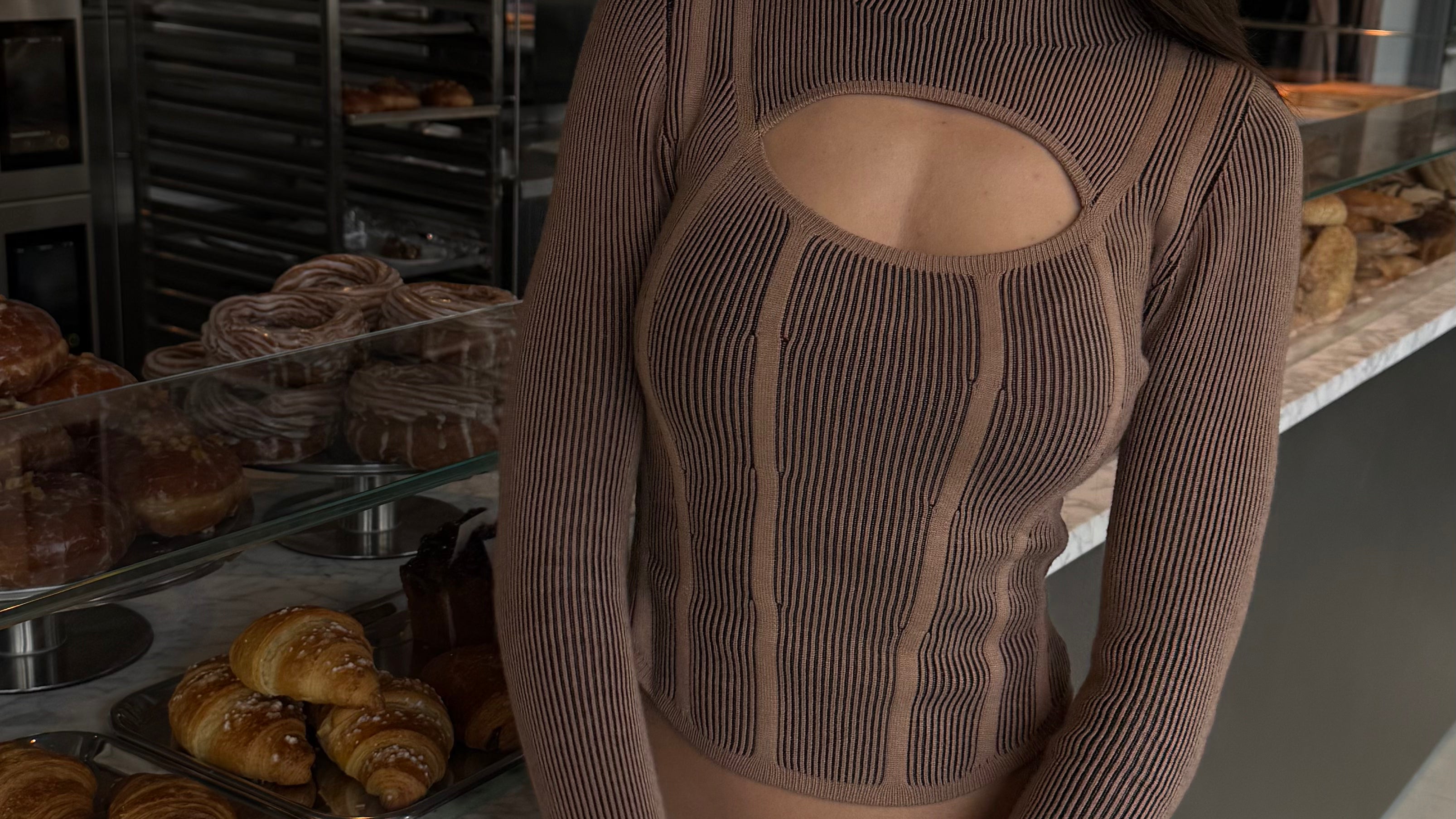 Longsleeve z dzianiny z dekoltem. Wygodny top w kolorze beżowym, który tworzy modowy look.