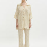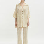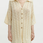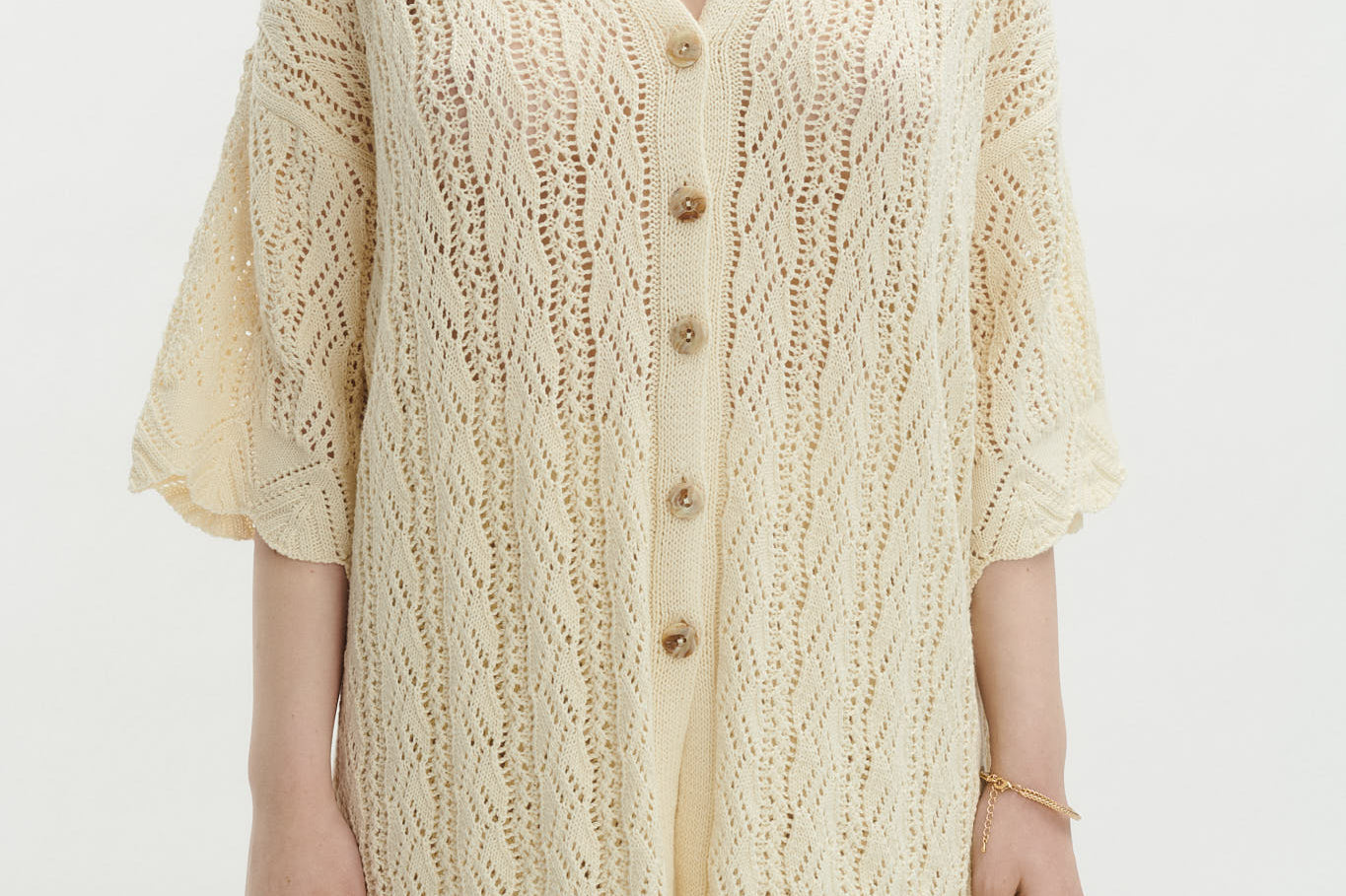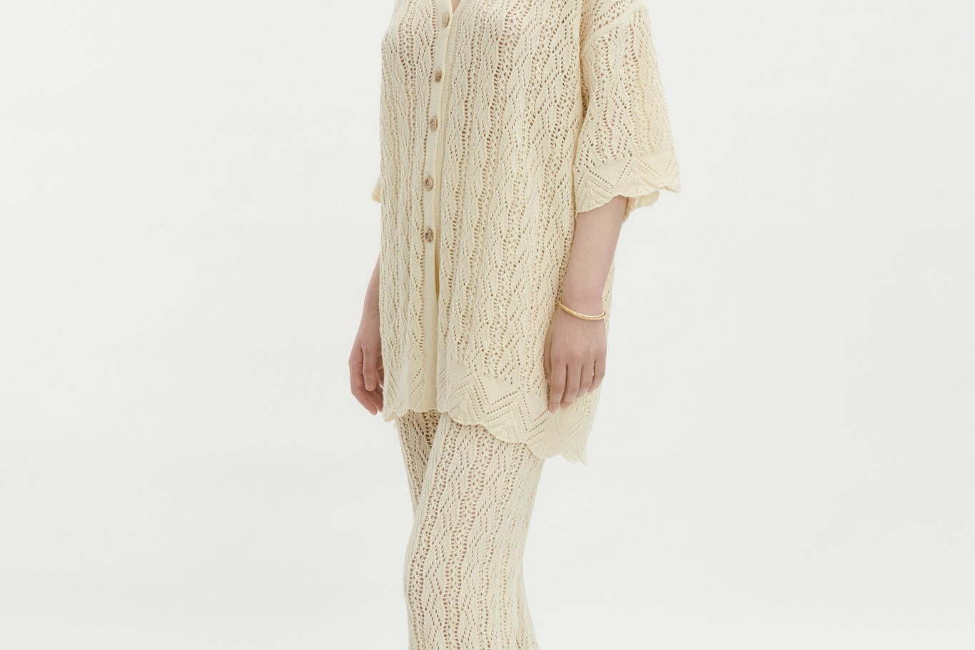 Nadine is a v-neck collared top made entirely from organic cotton. It has an oversized, loose fit and lowered shoulders. The top is crocheted, which makes it a perfect style for summer.